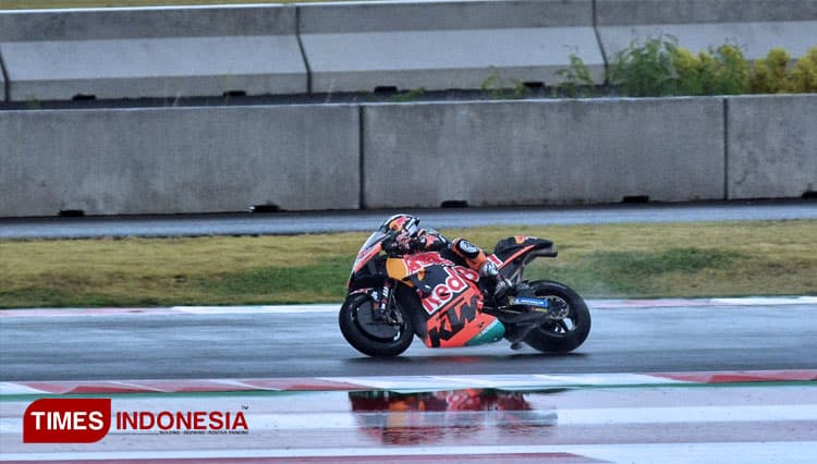 TIMES Cilacap/Pembalap tim Red Bull KTM, Miguel Oliveira melahap trek basah Sirkuit Mandalika, saat lomba seri kedua MotoGP di Mandalika, Lombok, NTB, Minggu (20/3/2022). (FOTO: Tria Adha/TIMES Indonesia)