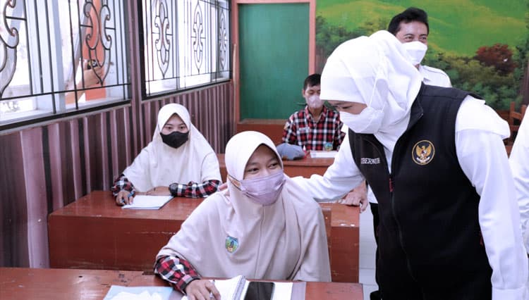 TIMES Cilacap/Gubernur Khofifah saat meninjau PTM terbatas. (FOTO: Dok.Humas Pemprov Jatim)