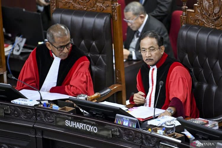 TIMES Cilacap/Ketua Mahkamah Konstitusi (MK) Suhartoyo (kanan) bersama Wakil Ketua MK Saldi Isra memimpin sidang pengucapan putusan perkara dilanjutkan atau tidak (dismissal) sengketa Pilkada 2024 di Gedung Mahkamah Konstitusi, Jakarta, Rabu (5/2/2025). (ANTARA)