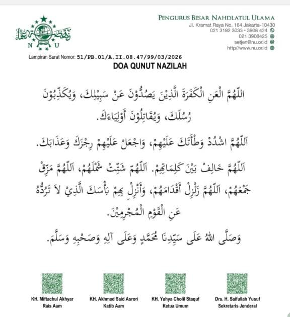 Instruksi tersebut tertuang dalam Surat Nomor: 51/PB.01/A.II.08.47/99/03/2026 tertanggal 11 Ramadhan 1447 H atau 1 Maret 2026 M. Surat itu ditandatangani Rais Aam dan Ketua Umum PBNU.