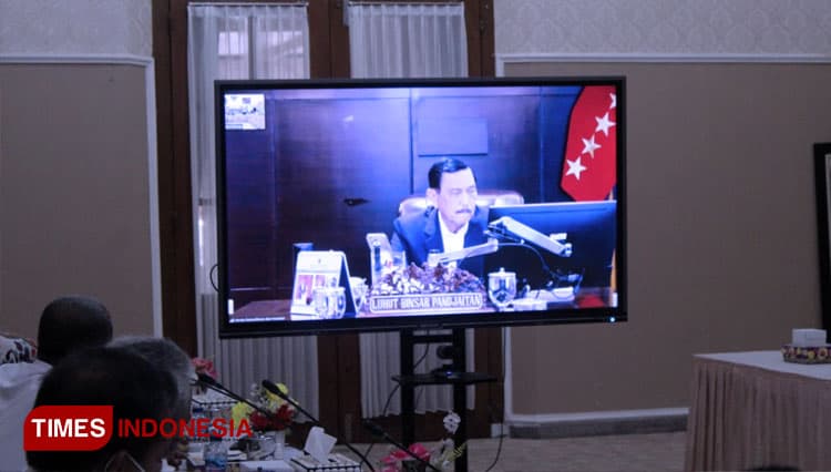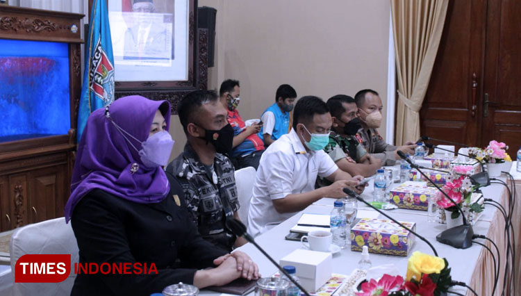 CILACAP – Forkopimda Cilacap mengikuti Rapat Evaluasi PPKM Jawa-Bali secara virtual di Ruang Prasandha, kompleks Rumah Dinas Bupati Cilacap, Jumat (11/2/2022). Rapat dipimpin Menko Luhut Pandjaitan.