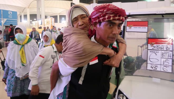 TIMES Cilacap/Petugas PPIH menggendong jemaah risti di bandara KAIA Jeddah, jelang pulang ke tanah air. (FOTO : istimewa).